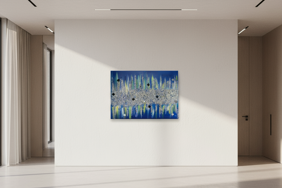 18in x 24in size canvas with a touch of class & pazas it would look gorgeous in any room. Made with crushed mirror glass and a mixture of glitters , mirrors.I'm a product description