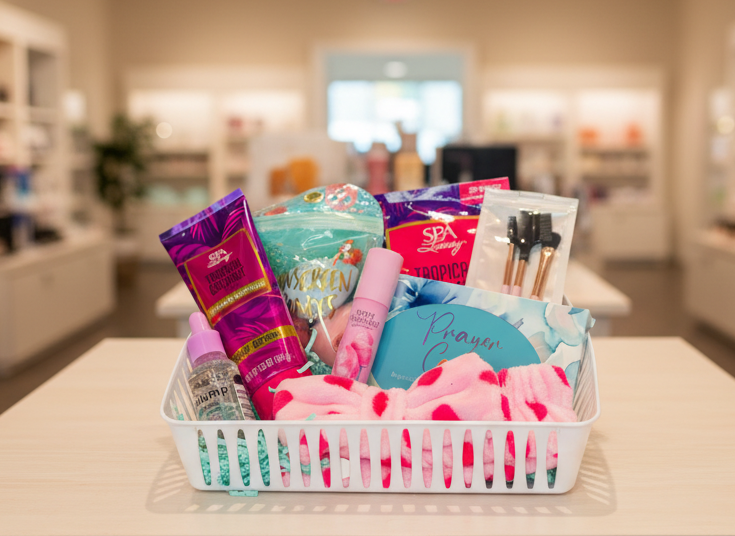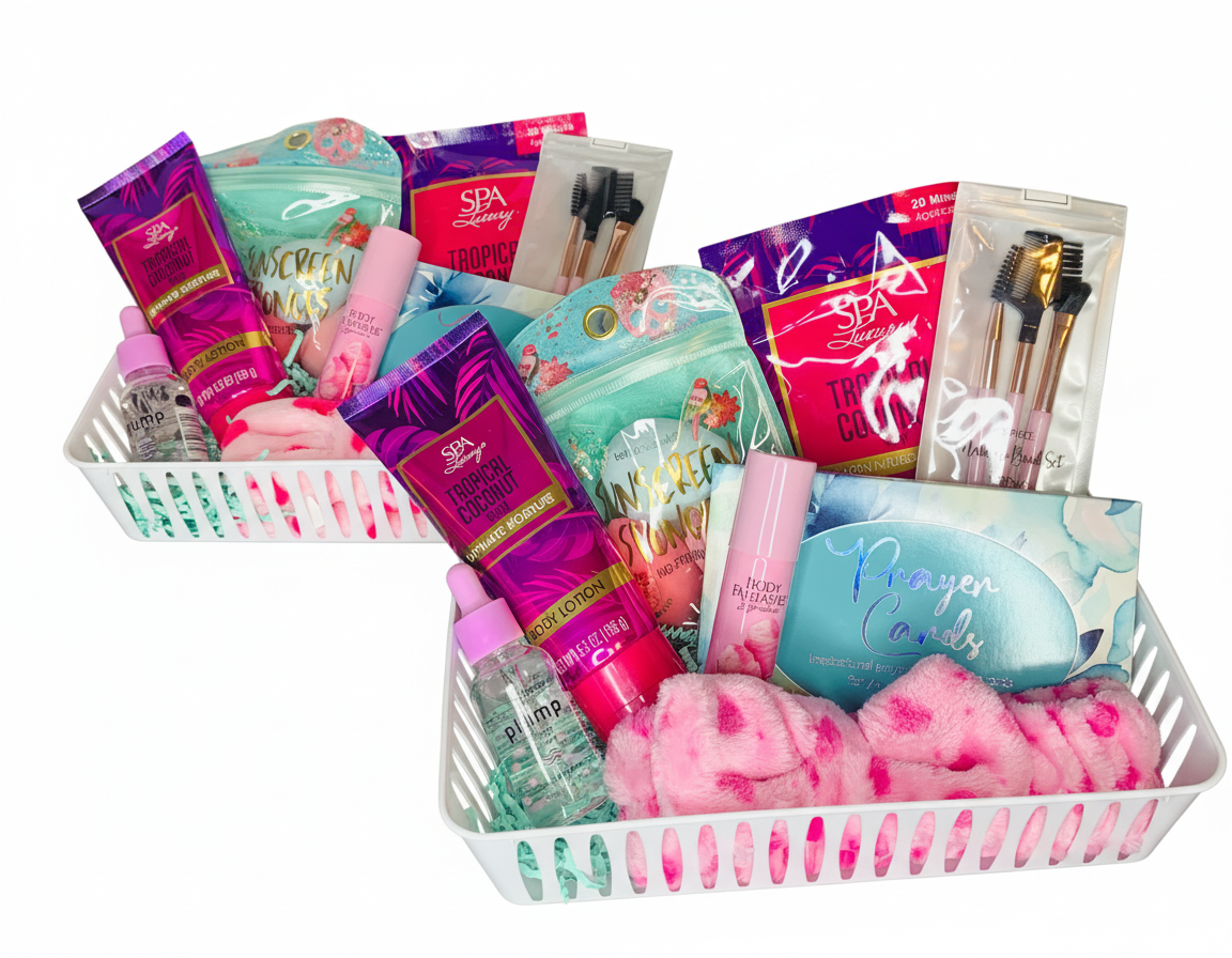 • Silky body lotion for all-over softness • Trio of plush beauty blenders for flawless application • Collagen-infused hand mask to restore and hydrate • Cotton Candy or Fresh White Musk body spray for a sweet, airy finish • 3-piece eyebrow grooming set for effortless definition • Cozy hair band or towel wrap for spa-like comfort • Glow-enhancing face serum • Prayer cards and/or Orange Blossom bath fizz for a moment of peace